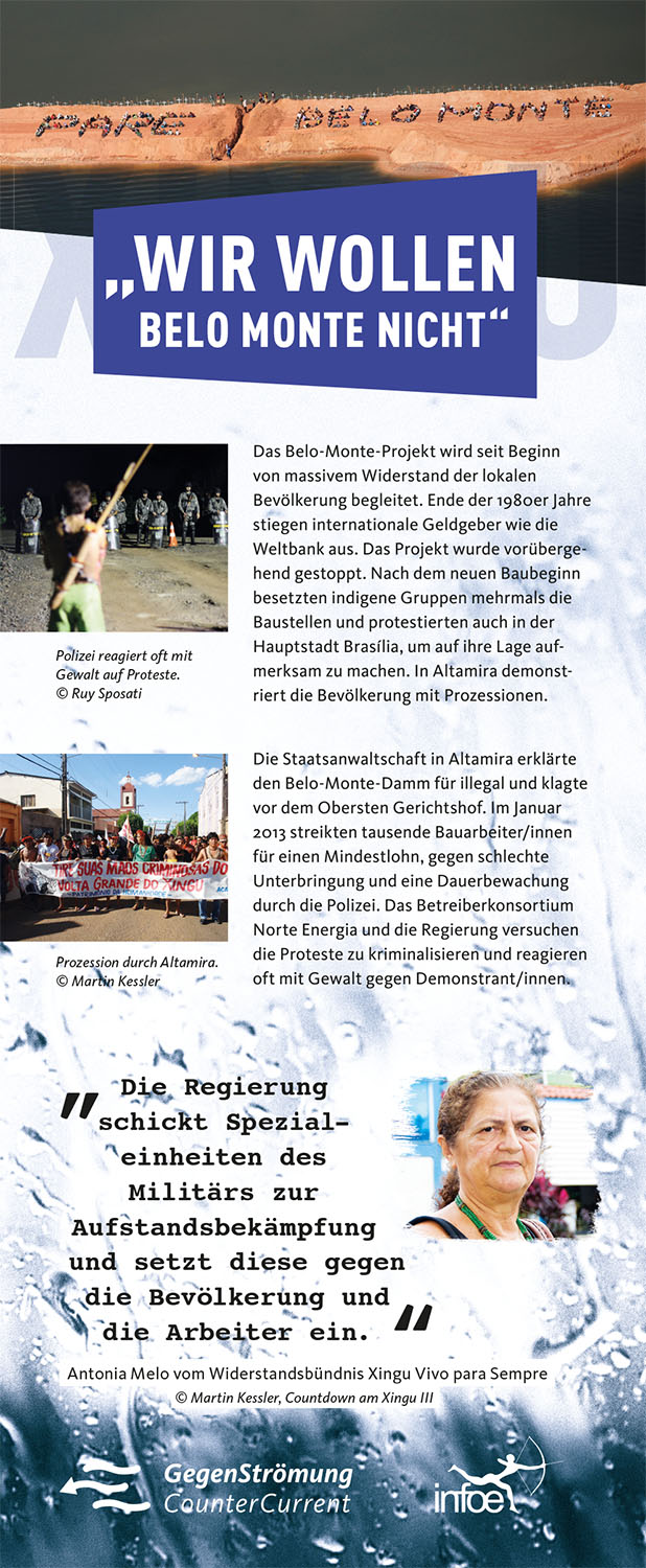 Am Beispiel des Belo-Monte-Staudamms in Brasilien beleuchtet die Ausstellung mit eindrucksvollen Bildern und prägnanten Texten die sozialen und ökologischen Auswirkungen großer Wasserkraft-Projekte. Sie eignet sich optimal, um einen umfassenden Überblick über dieses aktuelle Thema zu bekommen und ergänzt sich mit unserem bereits veröffentlichten Belo-Monte-Dossier. Die Ausstellungs-Roll-Ups sind einfach zu transportieren und unkompliziert im Auf- und Abbau.